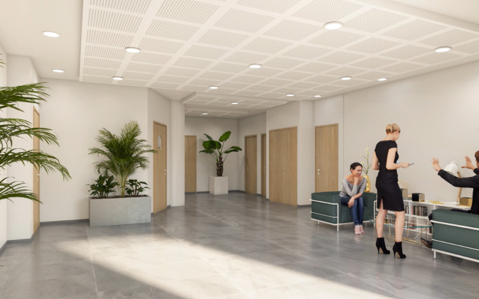Cet immeuble est en cours de rénovation : création d’open space, création d’une nouvelle VMC, remplacement du système de climatisation, remplacement des huisseries et vitreries, remplacement de faux plafond avec éclairage full led, installation CFO (luminaire, goulotte, PC), remplacement de la moquette par un sol souple PVC de qualité HQE.